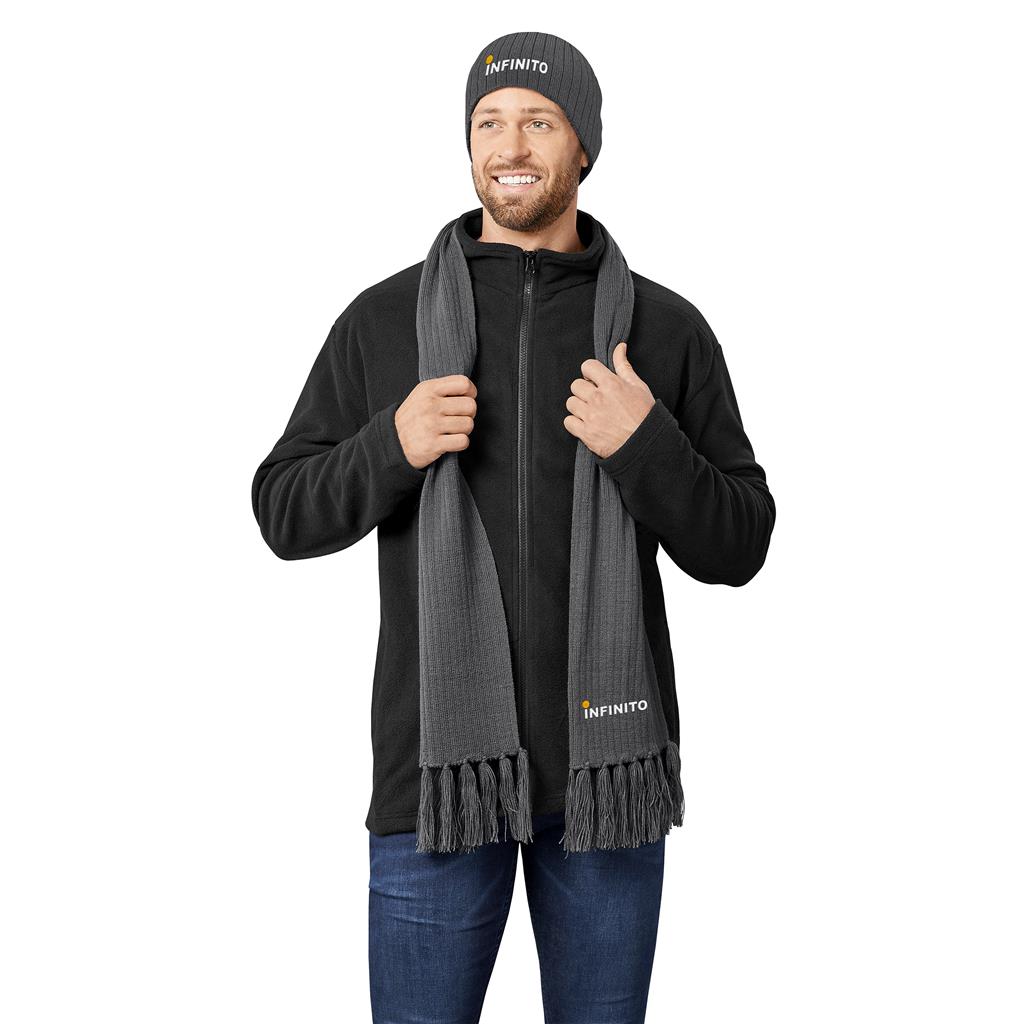 Stay warm this Winter, or in the outdoors, with this cosy scarf and beanie, packaged together in a drawstring bag.
